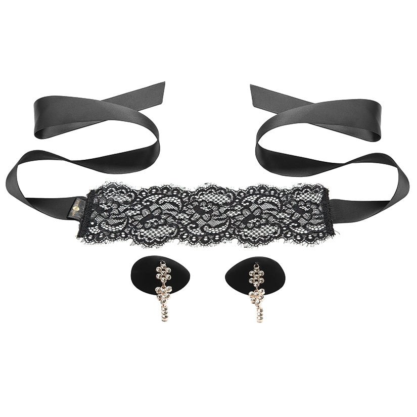 luxurious lace and satin blindfold and dazzling nipple pasties to adorn your